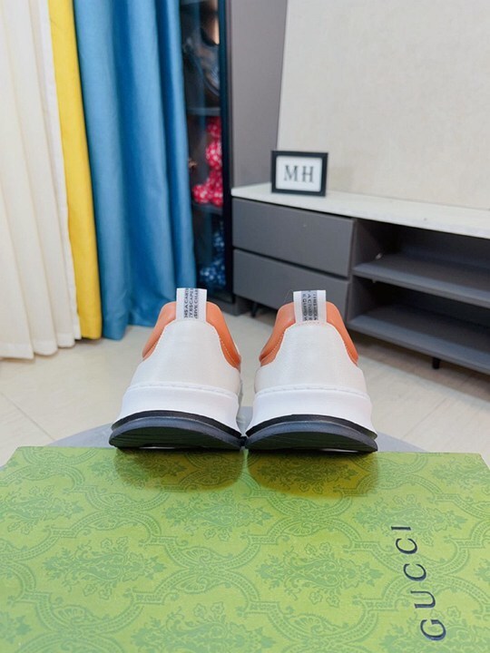 Le Sneakers Gucci Slip-On presentano una base in pelle bianca con accenti arancioni vivaci.